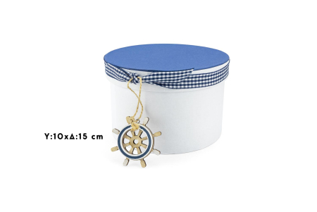 Αναδείξτε τη συσκευασία των δώρων σας ή οργανώστε το χώρο σας με αυτό το όμορφο Χειροποίητο Χάρτινο Κουτί Αποθήκευσης. Με ένα κλασικό σχέδιο, το λευκό κουτί με το μπλε καπάκι προσφέρει τόσο αισθητική αξία όσο και πρακτικότητα. Το κουτί μπορεί να διακοσμειθεί με μια ναυτική ριγέ κορδέλα και ένα διακοσμητικό ξύλινο τιμόνι, κάνοντάς το ιδανικό για δώρα, βαφτίσεις, αποθήκευση ή διακόσμηση. Η συμπαγής, αλλά ευρύχωρη σχεδίαση εξασφαλίζει ότι ταιριάζει σε κάθε χώρο, προσφέροντας παράλληλα μία αίσθηση θαλασσινής φρεσκάδας.