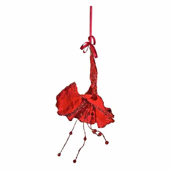 Μπουτονιέρα άνθος υφασμάτινο, σε κόκκινο χρώμα με κρεμαστούς στήμονες, διακοσμητικό για το χριστουγεννιάτικο δέντρο σας,