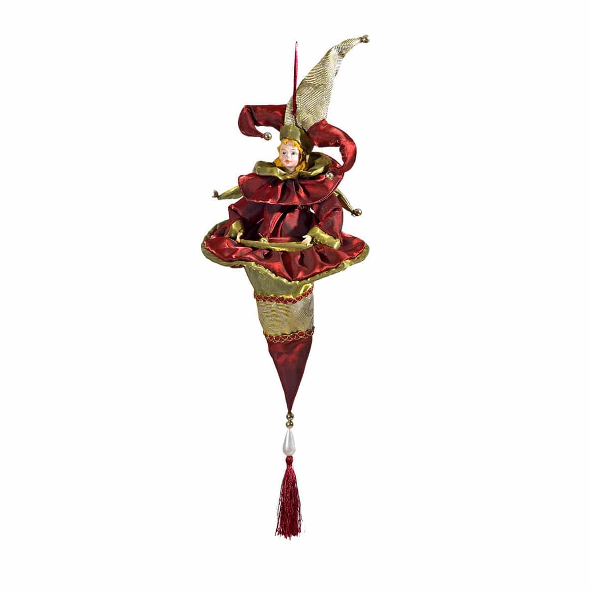 Αρλεκίνος διακοσμητικός υφασμάτινος σε μπορντό και χρυσούς τόνους, για το χριστουγεννιάτικο ντεκόρ του σπιτιού, Ύψος:55 εκ,