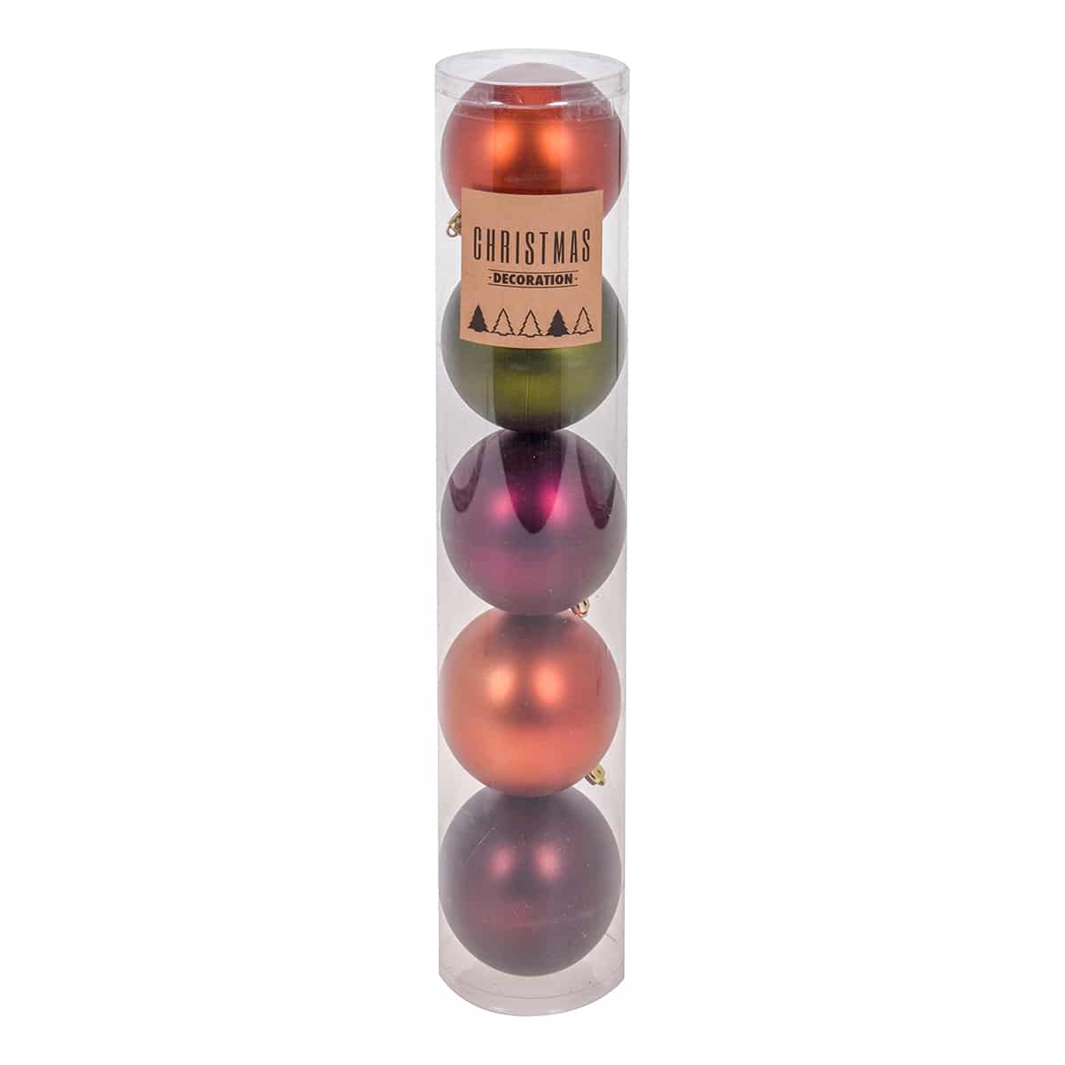 Πέντε χρωματιστές πλαστικές μπάλες για το χριστουγεννιάτικο δέντρο, χρώματος πορτοκαλί, πράσινο και φούξια, Σετ των πέντε, Φ10εκ,
