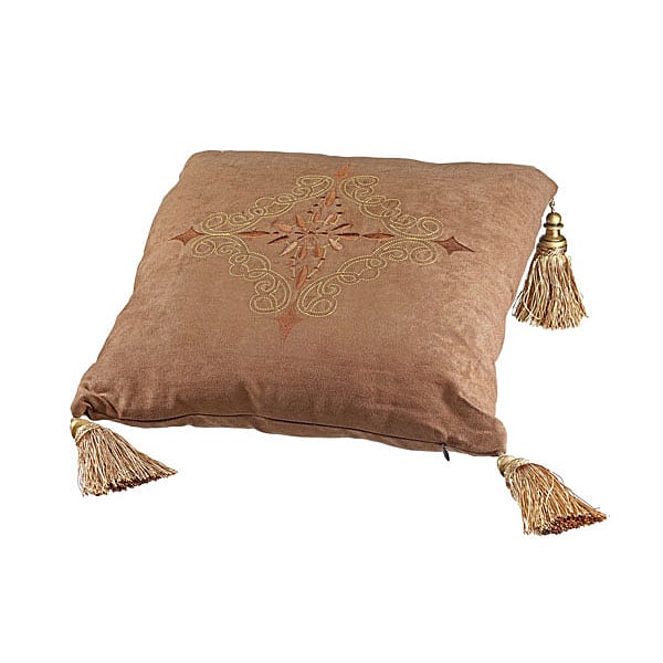 Όμορφο υφασμάτινο μαξιλάρι, σε χρώμα μπρονζέ, με περίτεχνο σχέδιο και φουντίτσες