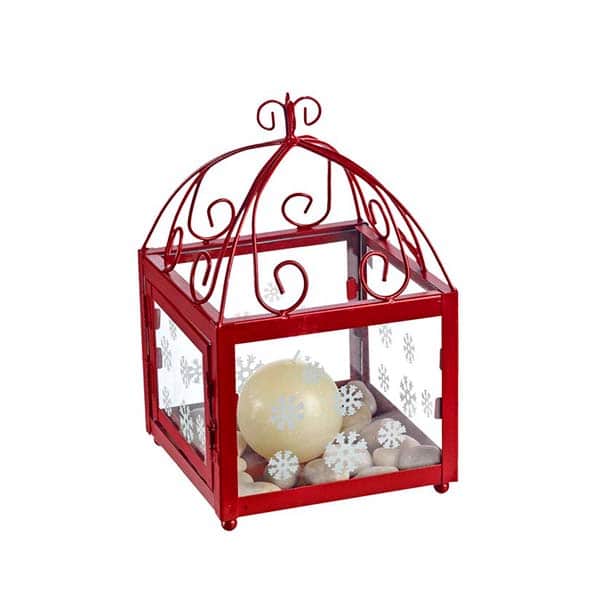 Μεταλλικό, διακοσμητικό φαναράκι χριστουγεννιάτικο, κόκκινου χρώματος, με γυαλί με σχέδιο λευκές χιονονιφάδες, που περιέχει κερί και πετρούλες,