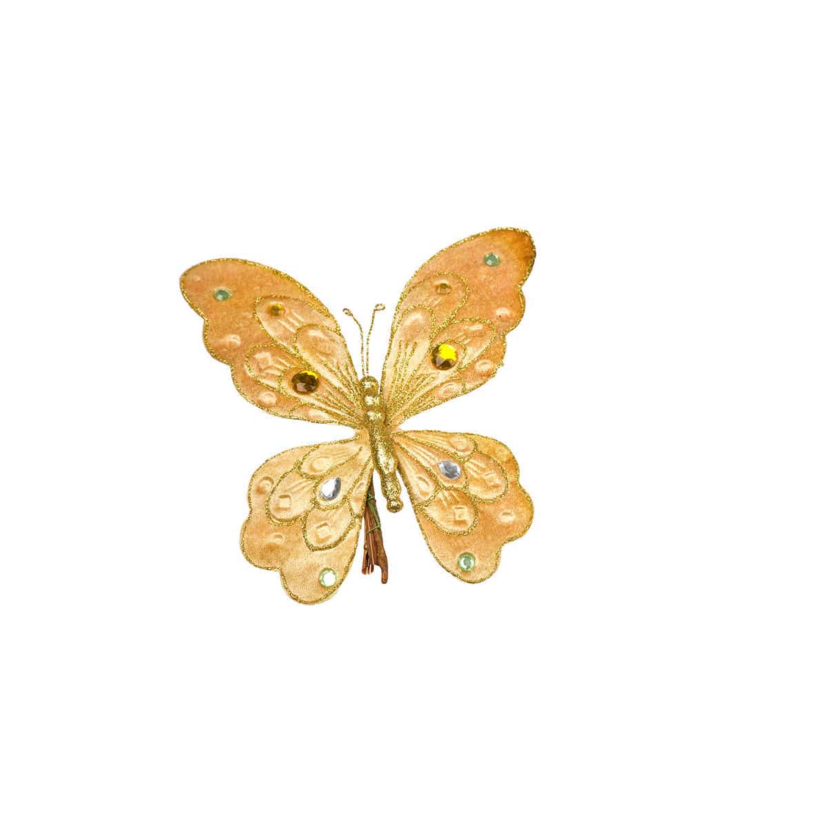 Εκρού διακοσμητική πεταλούδα, χριστουγεννιάτικη στολισμένη με πετρούλες κίτρινες και γαλάζιες,