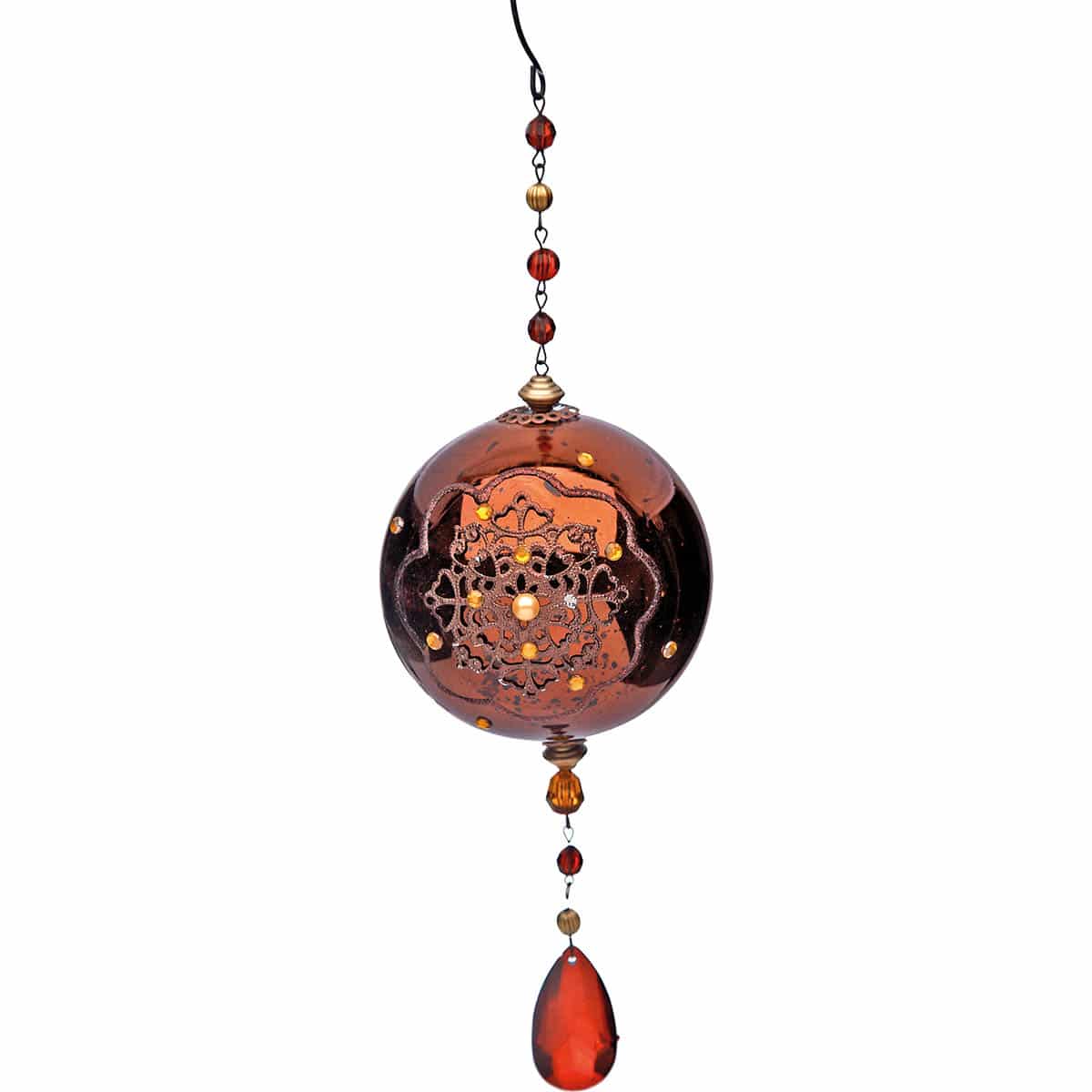 Γυάλινη χριστουγεννιάτικη μπάλα, κόκκινου γυαλιστερού χρώματος, με περίτεχνο σχέδιο, κίτρινες πετρούλες διακοσμητικές και κόκκινο πετράδι κρεμαστό,