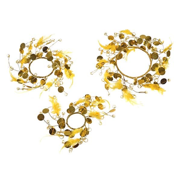 Στεφάνι χριστουγεννιάτικο διακοσμητικό, χρυσού χρώματος, φτιαγμένο από φτερά και πούλιες,