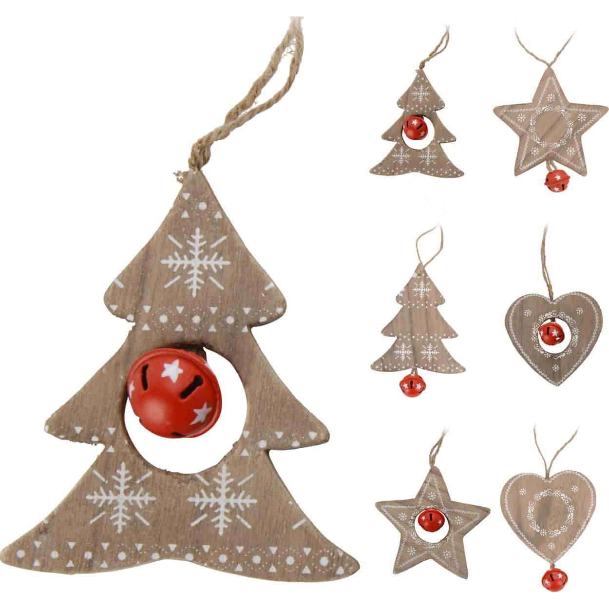 Ξύλινα διακοσμητικά δέντρου με κόκκινο κουδουνάκι, σε έξι διαφορετικά σχέδια με έλατα, αστεράκια και καρδούλες,