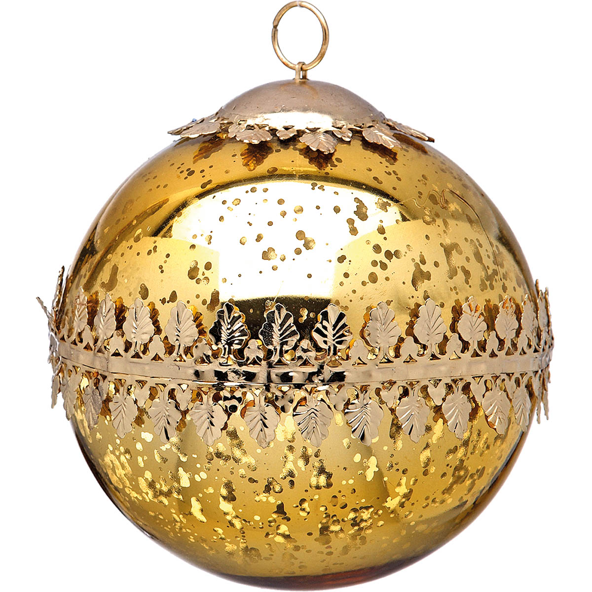Γυάλινη χριστουγεννιάτικη μπάλα, σε χρυσαφί χρώμα, με χρυσοποίκιλτες, ανάγλυφες διακοσμητικές λεπτομέρειες,
