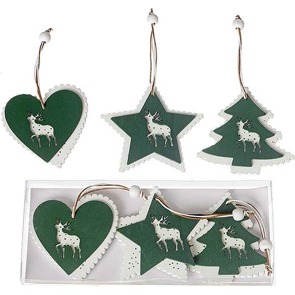 Ξύλινα στολίδια για το δέντρο, σε λευκό και πράσινο χρώμα με σχέδιο τρύπα ελαφάκι, Σε τρία σχέδια, καρδιά, αστέρι και δέντρο, Σετ των τριών,