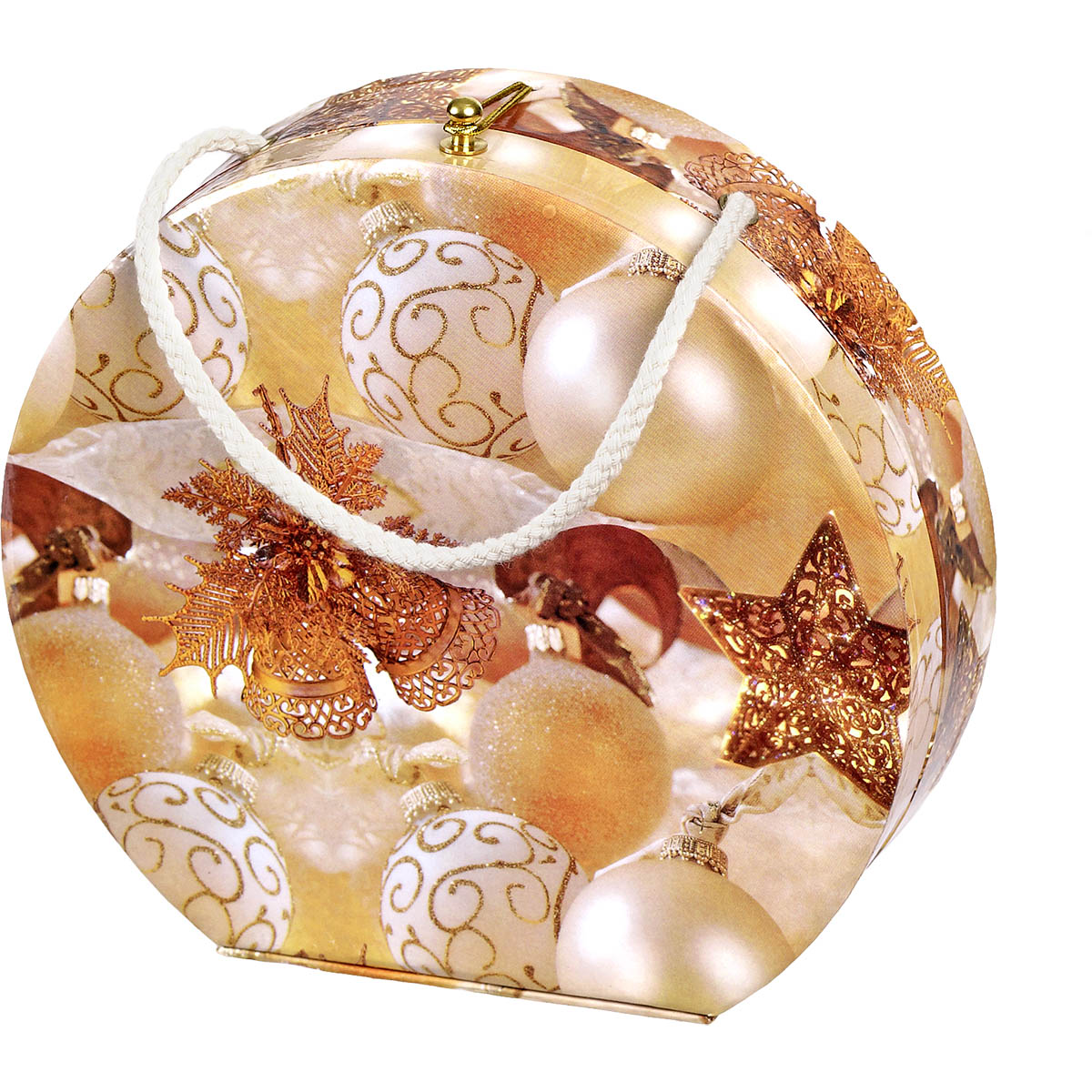 Χριστουγεννιάτικο χάρτινο στρογγυλό κουτί, διαφόρων χρήσεων, με μπάλες, καμπανούλες και αστερια