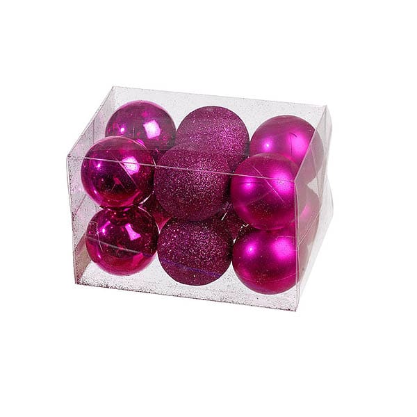 Μπάλες πλαστικές χριστουγεννιάτικες σε φούξια χρώμα ματ, γκλίτερ και γυαλιστερό, Σετ των δώδεκα, Φ5εκ,