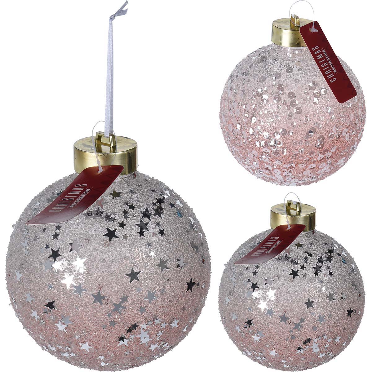 Μπάλα πλαστική χριστουγεννιάτικη, σε ροζ ματ χρώμα, με δύο σχέδια, αστεράκια ασημί και κυκλάκια ασημί, Φ13εκ,