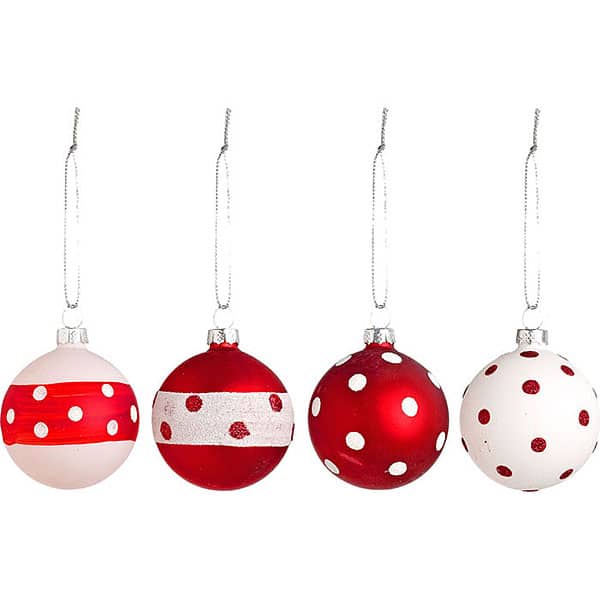 Γυάλινες μπάλες χριστουγεννιάτικες σε τέσσερα σχέδια, κόκκινου και λευκού χρώματος, με σχέδιο πουά λευκό και κόκκινο, αντίστοιχα, Φ6εκ,