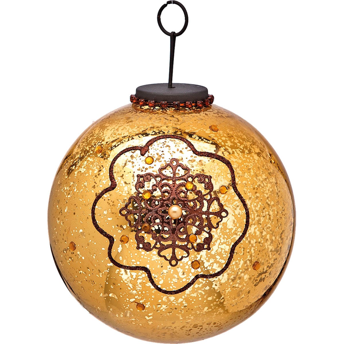 Γυάλινη χριστουγεννιάτικη μπάλα, σε κίτρινη απόχρωση με περίτεχνο σχέδιο και στρασάκια,