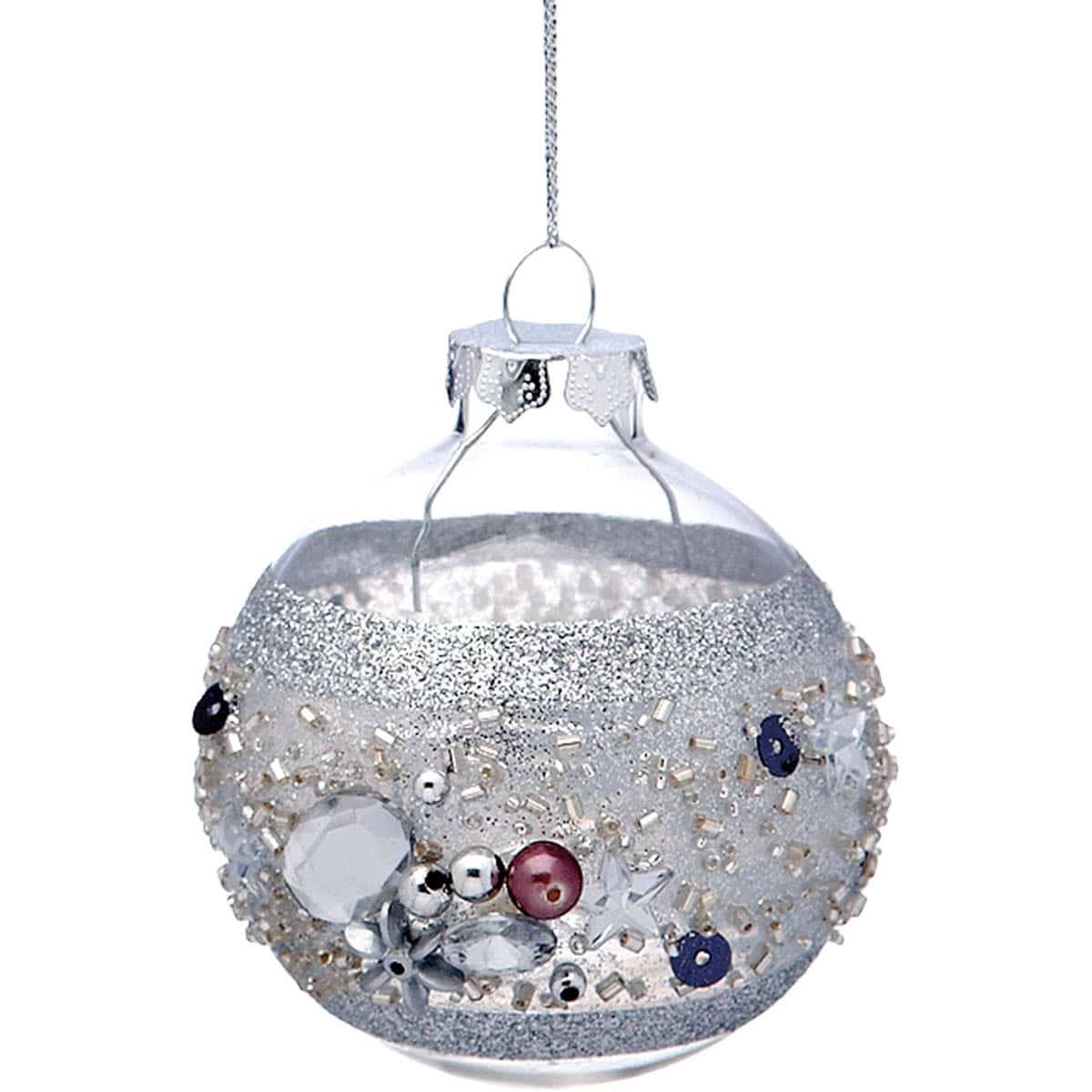 Γυάλινη χριστουγεννιάτικη διάφανη μπάλα δέντρου, με γκλίτερ σχέδιο και χρωματιστές λεπτομέρειες στην διακόσμηση, Συσκευασία των τριών, Φ7εκ,