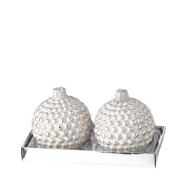 Χριστουγεννιάτικο κερί μπάλα, με πέρλες, σε λευκό-ασημί χρώμα, σε ΣΕΤ των 2
