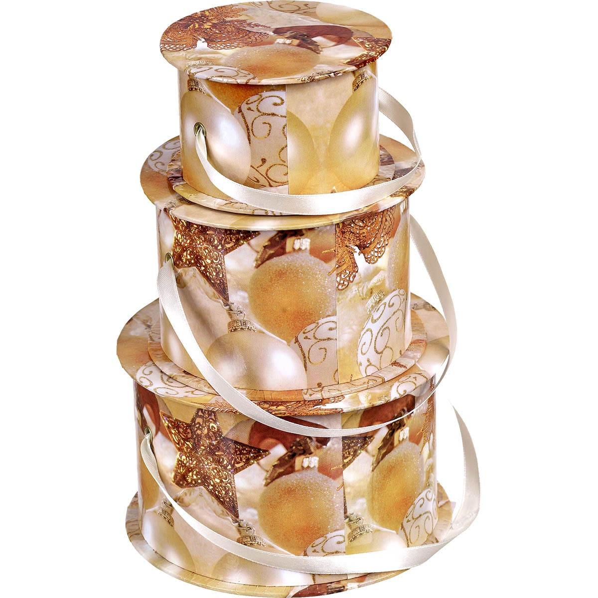 Χριστουγεννιάτικο χάρτινο στρογγυλό κουτί, διαφόρων χρήσεων, με μπάλες, καμπανούλες και αστέρια, σε ΣΕΤ των 3