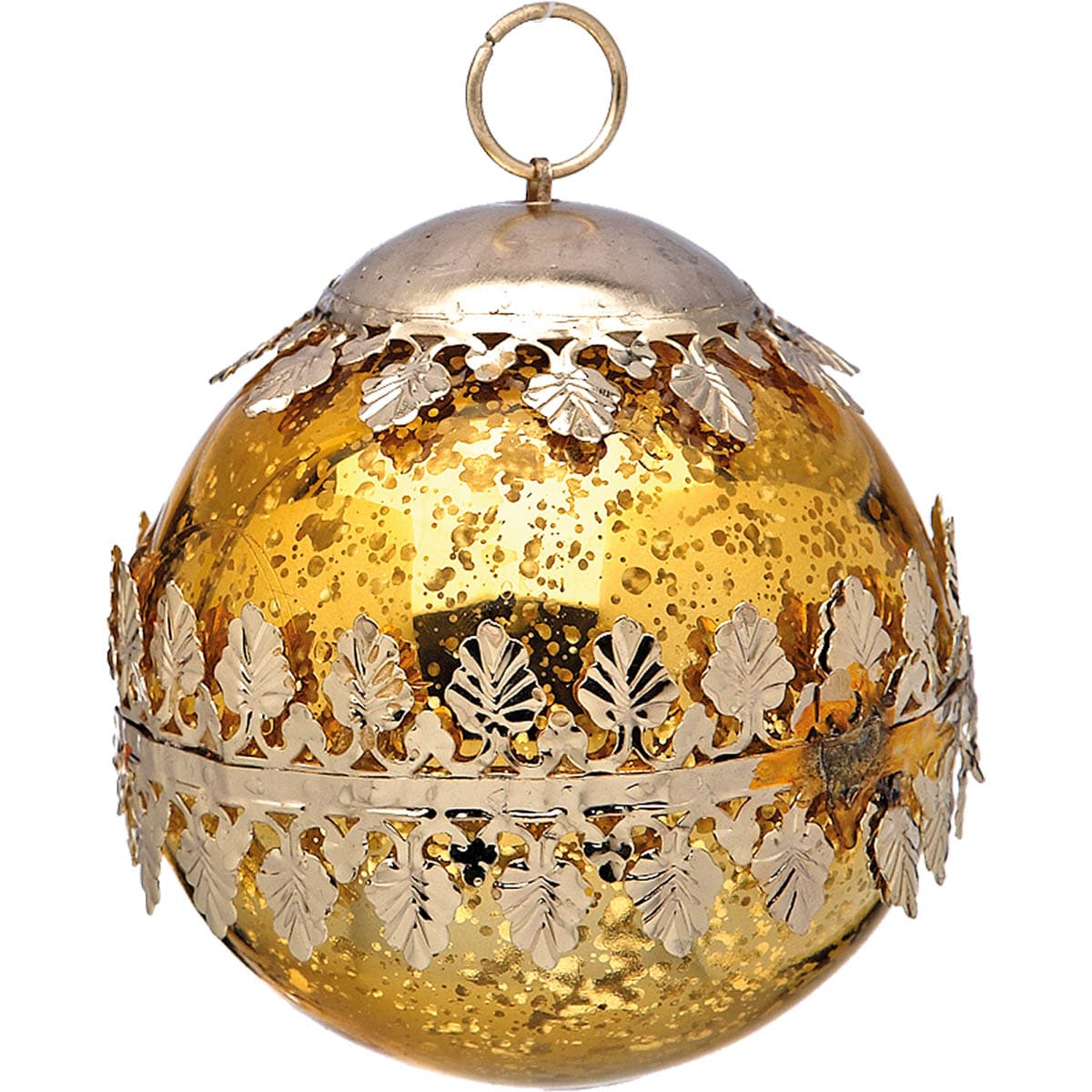 Γυάλινη χριστουγεννιάτικη μπάλα, σε χρυσό χρώμα, διακοσμημένη με μεταλλικά περίτεχνα στολίδια,
