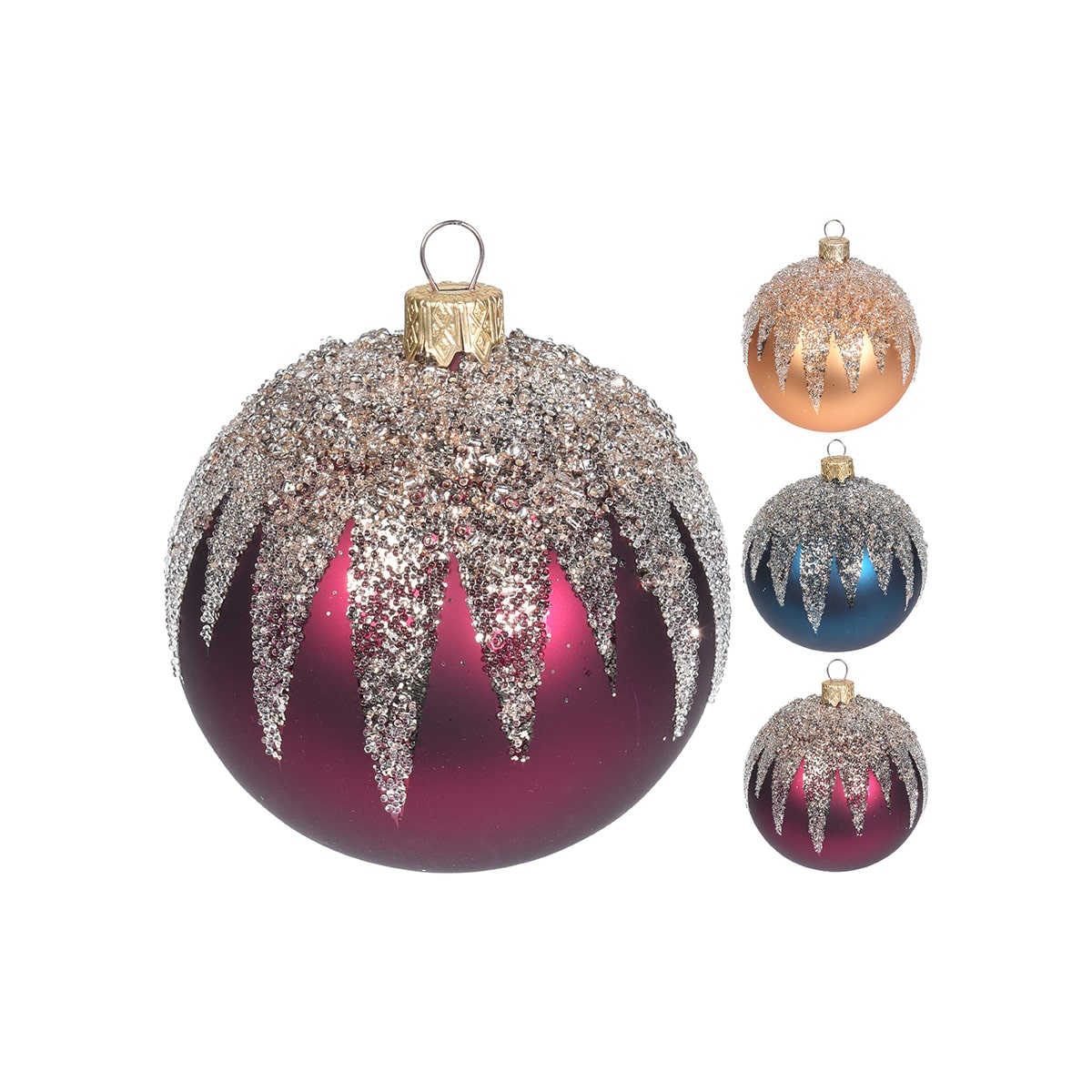 Γυάλινη χριστουγεννιάτικη μπάλα δέντρου, με γκλίτερ σχέδιο, σε τρία ματ χρώματα, κίτρινη, μπλε και φούξια,
