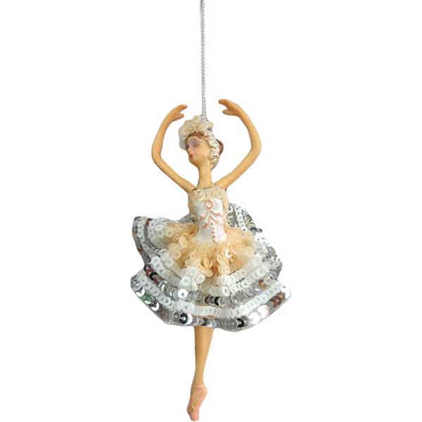 Διακοσμητική μπαλαρίνα κρεμαστή, από πολυρητίνη με φόρεμα από πούλιες, Ύψος: 17εκ,