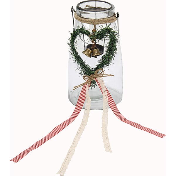 Γυάλινο κηροπήγιο διακοσμημένο με καμπανούλες, καρδούλα και κορδελίτσες