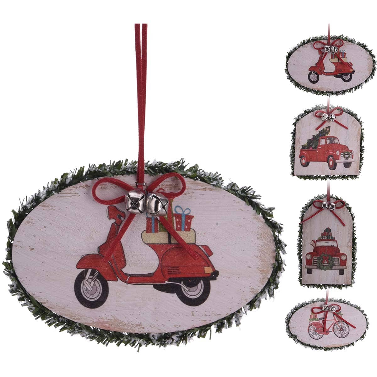 Διακοσμητικά δέντρου, από ξύλο σε τέσσερα σχέδια με απεικονίσεις, μηχανή, αυτοκίνητο, φορτηγό και ποδήλατο, που μεταφέρουν χριστουγεννιάτικα δώρα,