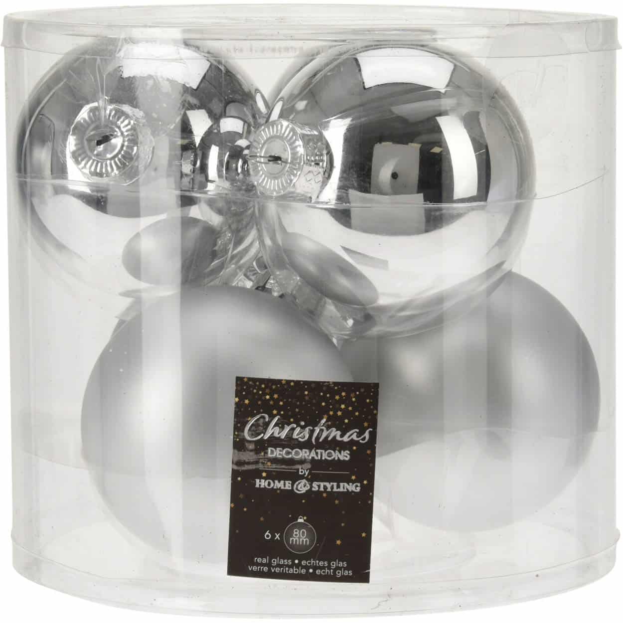 Γυάλινες μπάλες χριστουγεννιάτικες, σε ασημί χρώμα, ματ και γυαλιστερό, σε συσκευασία των έξι, Φ8εκ,