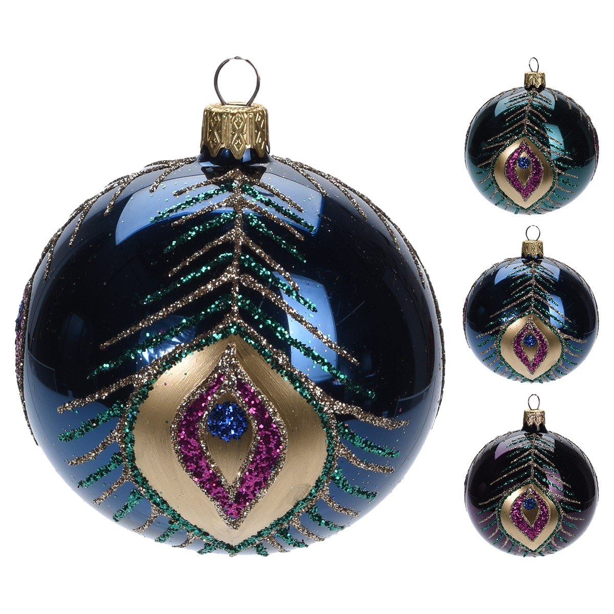 Γυάλινη μπάλα χριστουγεννιάτικη, με γκλίτερ σχέδιο ουρά παγωνιού, σε τρία γυαλιστερά χρώματα, πράσινο σκούρο, μπλε σκούρο και φούξια σκούρο, Φ10εκ,