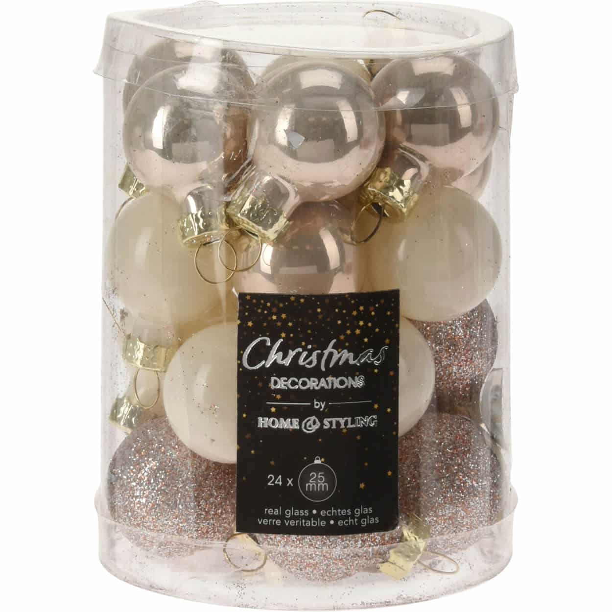 Γυάλινες χριστουγεννιάτικες μπάλες, σε τρεις χρωματικούς συνδυασμούς, μπεζ, κρεμ, κρεμ-περλέ, Σετ των εικοσιτεσσάρων, Φ2,5εκ,