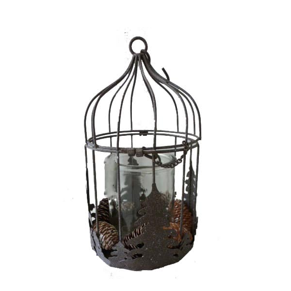 Κρεμαστό κηροπήγιο κλουβί, με περίτεχνο μεταλλικό περίβλημα, γυάλινη βάση κεριού και κουκουνάρια