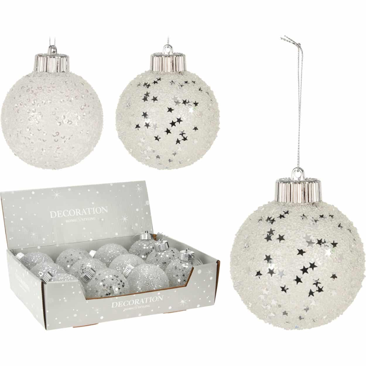 Μπάλα πλαστική, διακοσμητική, λευκού χρώματος σε δύο σχέδια με ανάγλυφες λεπτομέρειες και αστεράκια ασημί, Συσκευασία των δώδεκα, Φ8εκ,