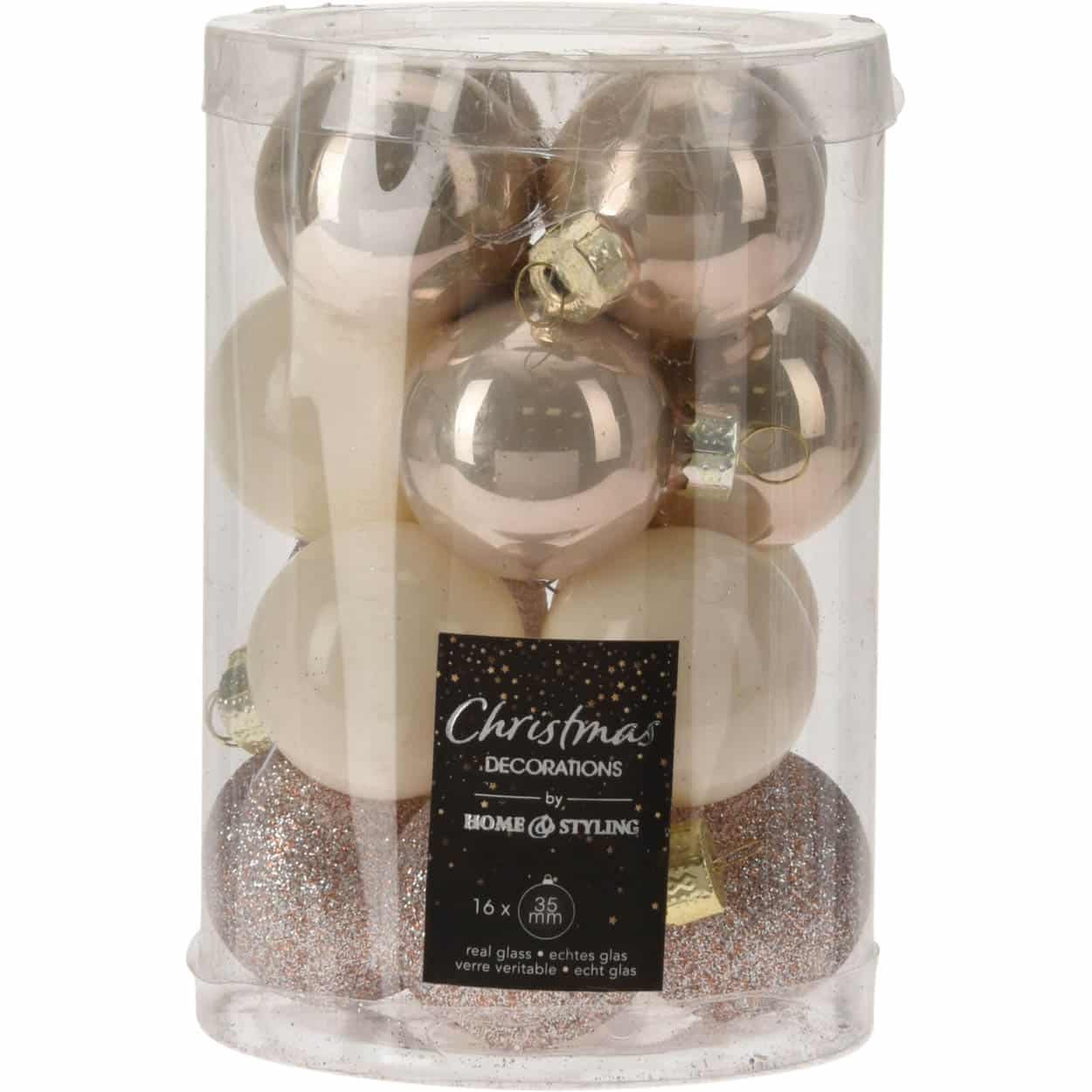 Γυάλινες χριστουγεννιάτικες μπάλες, σε τρεις χρωματικούς συνδυασμούς, μπεζ, κρεμ, κρεμ-περλέ, Σετ των δεκαέξι, Φ3,5 εκ,