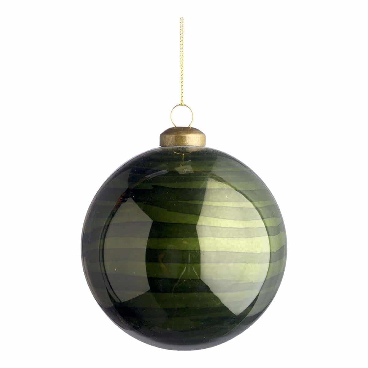 Γυάλινη χριστουγεννιάτικη μπάλα, πράσινου χρώματος με ρίγες που εναλλάσσονται από σκούρο πράσινο σε ανοιχτό, Φ10εκ,