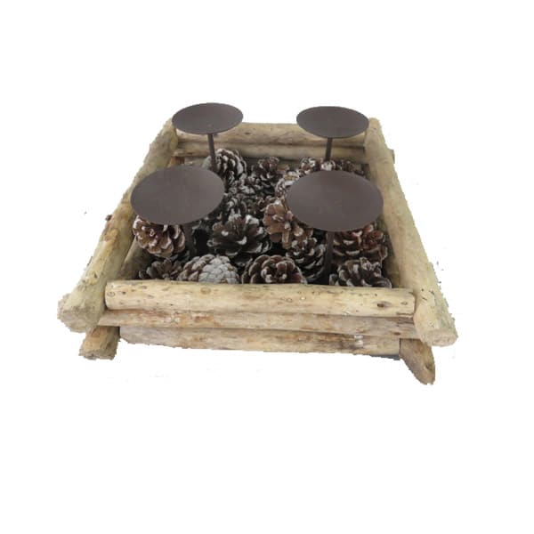 Πρωτότυπο ξύλινο κηροπήγιο, με μεταλλικές βάσεις για κεριά και πολλά κουκουνάρια
