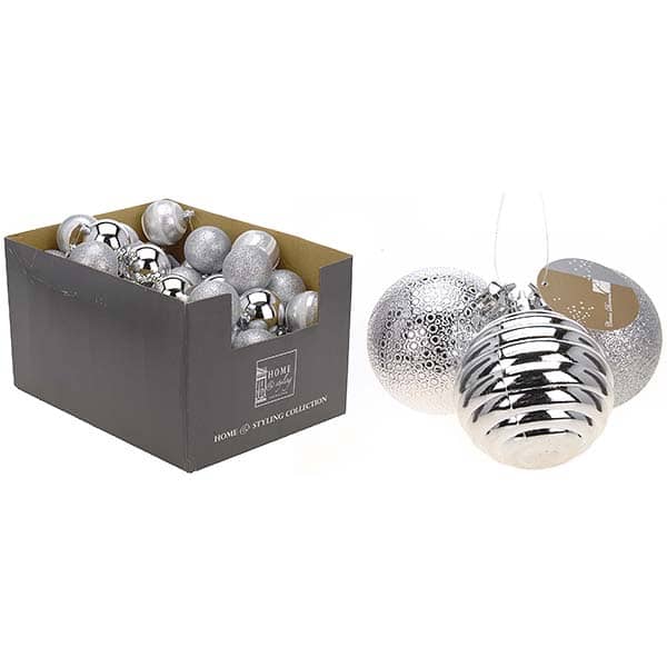 Μπάλα χριστουγεννιάτικη πλαστική, ασημί χρώματος, σε ματ, γυαλιστερό και γκλίτερ, με σχέδια, Φ6εκ,