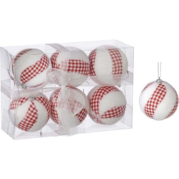 Μπάλα χριστουγεννιάτικη, πλαστική, λευκή, με κόκκινες καρό ρίγες, Σε σετ των έξι, Φ8εκ,