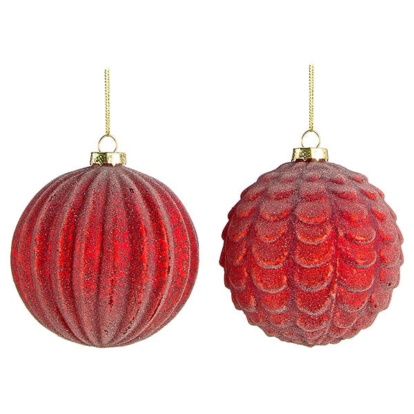 Γυάλινες μπάλες χριστουγέννων κόκκινες, σε δύο σχέδια, με ανάγλυφες αυλακώσεις και σχέδιο κουκουναριού, Φ10εκ,