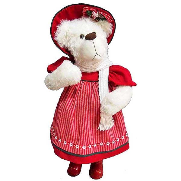Λούτρινο, λευκό αρκουδάκι με κόκκινο φόρεμα και καπέλο,