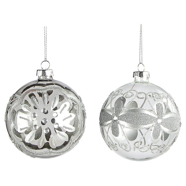 Γυάλινη μπάλα χριστουγεννιάτικη σε ασημί χρώμα, με περίτεχνα, ανάγλυφα διακοσμητικά και στρασάκια, Σε δύο σχέδια, Φ8εκ,