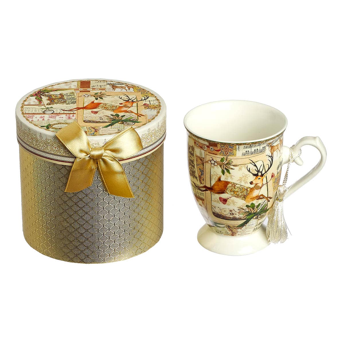 Κούπα από πορσελάνη, με ζωγραφιστό ελαφάκι και λευκή φουντίτσα, σε υπέροχο κουτί με χρυσή κορδέλα