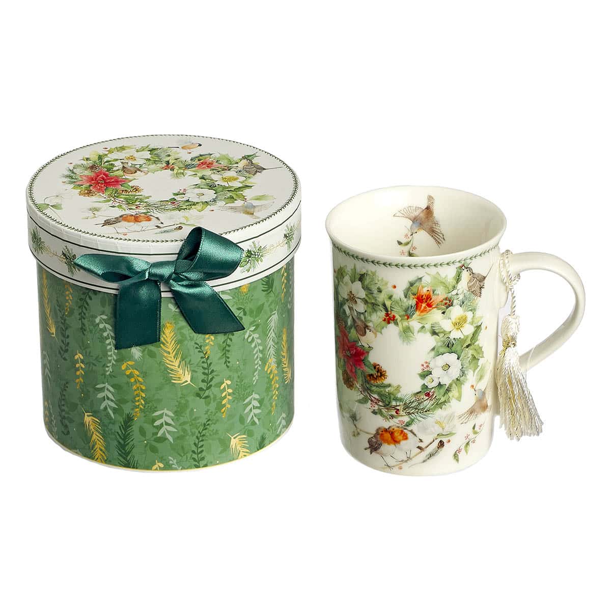 Κούπα από πορσελάνη, με ζωγραφιστό Χριστουγεννιάτικο στεφάνι και λευκή φουντίτσα, σε υπέροχο κουτί με πράσινη κορδέλα