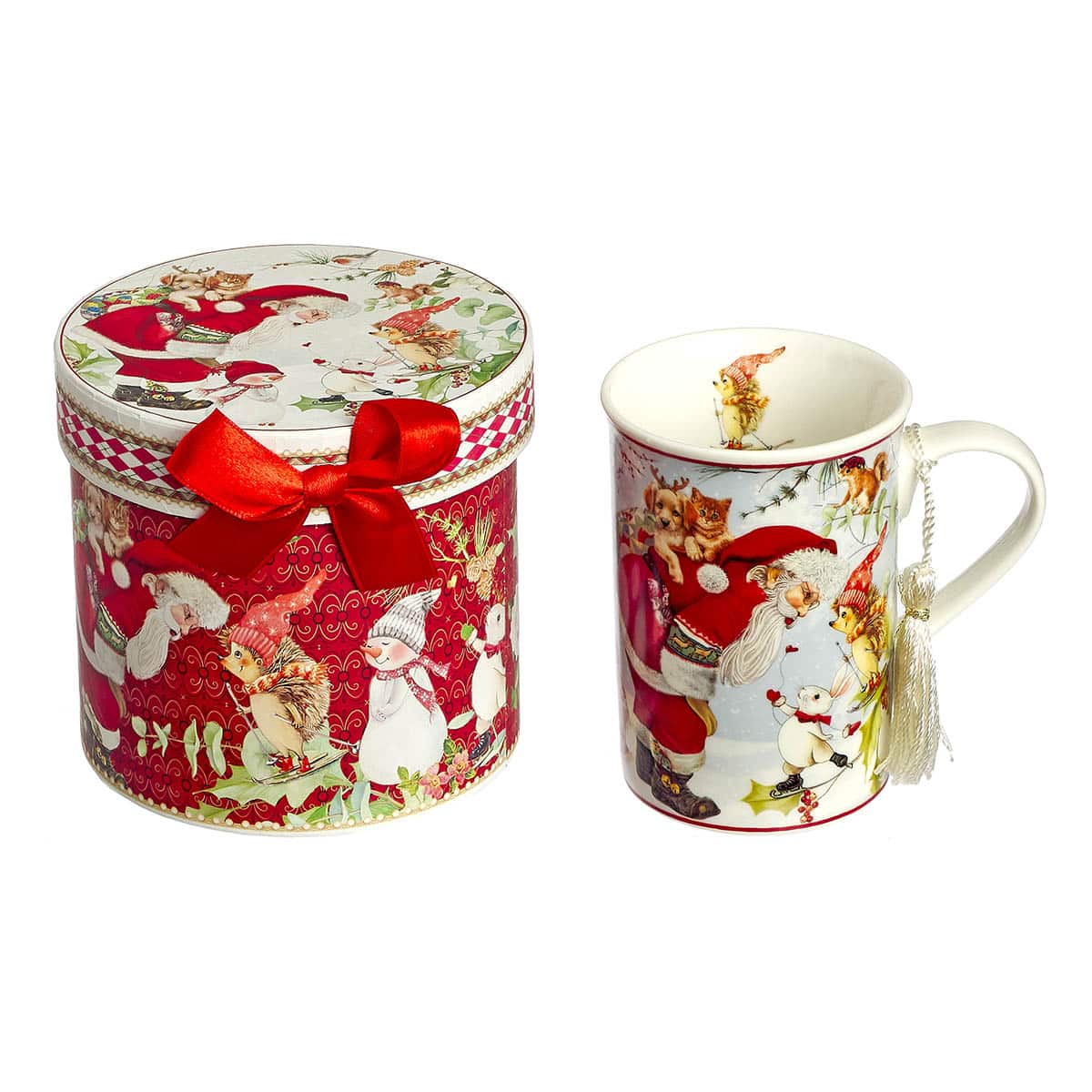 Κούπα από πορσελάνη, ζωγραφισμένη με όμορφη Χριστουγεννιάτικη παράσταση με τον Άγιο Βασίλη και λευκή φουντίτσα, σε υπέροχο κουτί με κόκκινη κορδέλα