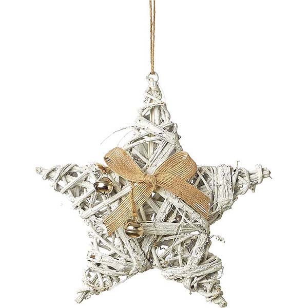 Διακοσμητικό χριστουγεννιάτικο αστέρι κρεμαστό, από ξύλο, λευκό, με κορδέλα και κουδουνάκια, Ύψος: 20 εκ,