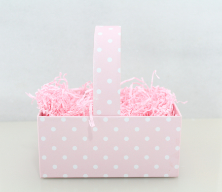 Καλάθι χάρτινο χειροποιήτο ροζ με λευκά πουά, κατάλληλο για μαρτυρικά βάφτισης.