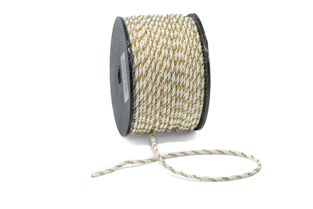 Καλώς ήρθατε στον κόσμο της κομψότητας! Ανακαλύψτε το Κορδόνι Στριφτό Τρίκλωνο Μεταξωτό Λευκό-Χρυσό 3mm, την επιτομή της φινέτσας για κάθε σας δημιουργία.