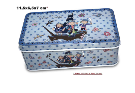 Υψηλής ποιότητας μεταλλικό κουτάκι με μεταλλικό καπάκι σε γαλάζια απόχρωση, και τύπωμα πειρατές και logo “Blue Ocean”.