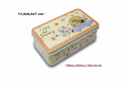 Υψηλής ποιότητας μεταλλικό κουτάκι με μεταλλικό καπάκι σε μπεζ απόχρωση, και τύπωμα λουλουδάκια, αμαξάκι και logo “Enjoy the journey”.