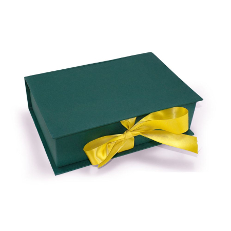 Κουτί βιβλίο χάρτινο χειροποίητο σε πράσινη απόχρωση με ανάγλυφο χαρτί απομίμηση υφάσματος και κίτρινη σατέν κορδλέλα.