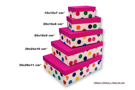 Κουτί χειροποίητο φτιαγμένο από σκληρό χαρτόνι σε λευκό χρώμα με πολύχρωμα πουά και φούξια καπάκι.