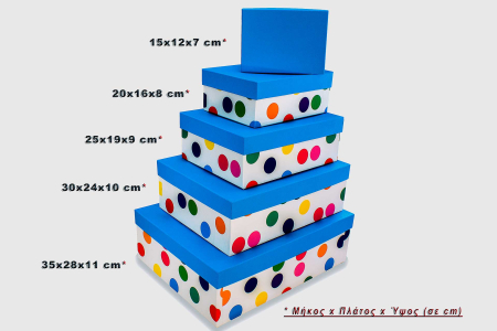 Κουτί χειροποίητο φτιαγμένο από σκληρό χαρτόνι σε λευκό χρώμα με πολύχρωμα πουά και σιέλ καπάκι.