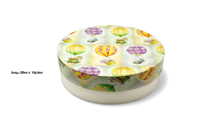 Κουτί χειροποίητο φτιαγμένο από σκληρό χαρτόνι, στρογγυλό, ρηχό με εκτύπωση στο καπάκι "αερόστατα" σε λευκή απόχρωση.